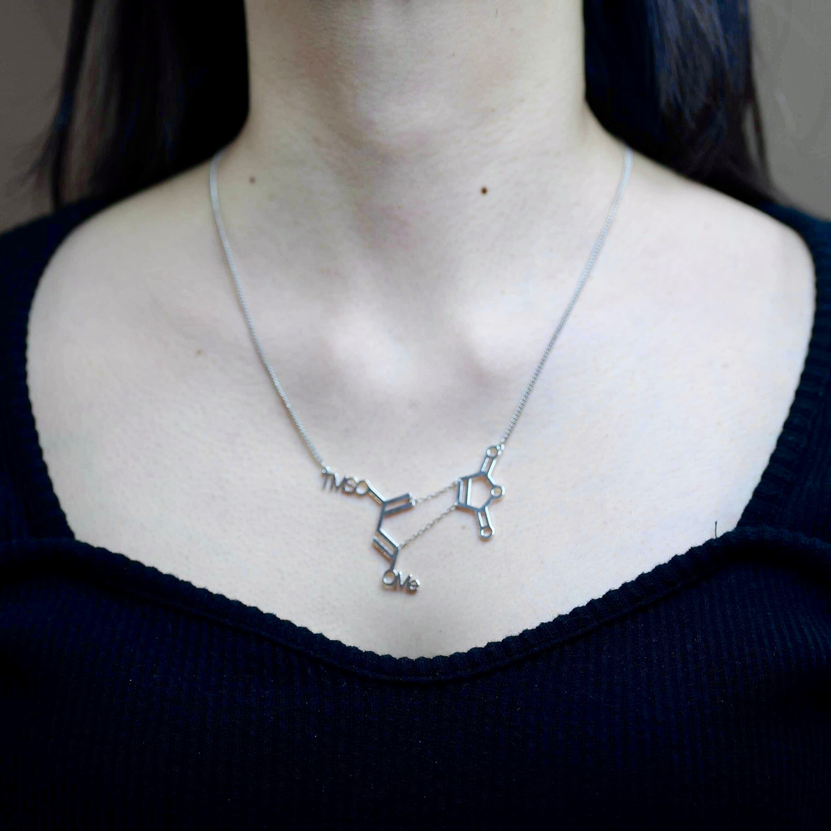 ディールズアルダー反応は100年前にディールズとアルダーが発見した反応です。彼らはこの功績により1950年にノーベル賞を受賞し、ディールズアルダー反応は現在でも合成化学の現場で頻繁に用いられています。このネックレスは、左側の4炭素成分と右側の2炭素成分が反応して6員環を形成する反応の遷移状態を表しています。この2と4が合わさって6になる反応は直感的に思えるかもしれませんが、実際には反応に用いる基質を綿密に設計しないとうまくいきません。このネックレスのモチーフになっている反応は実際に非常にスムーズに進行するもののうちの一つです。